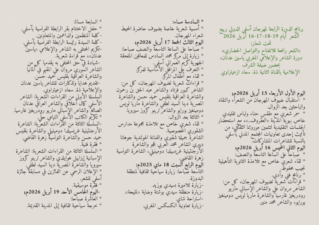 تنظم جمعية منتدى رع للثقافة والإبداع بآسفي وبشراكة مع كلية اللغة العربية بمراكش وجامعتي قادش وإشبيليا الإسبانيتين، ابتداءً من غد الثلاثاء 14 أبريل الجاري، الدورة الرابعة لمهرجان آسفي الدولي “ربيع الشعر”، بجهة مراكش-آسفي، تحت شعار: “الشعر رافعة للانفتاح والتواصل الحضاري”، دورة الشاعر المغربي ياسين عدنان، بحضور ضيفة الشرف الإعلامية بالقناة الثانية سعاد ازعيتراوي.