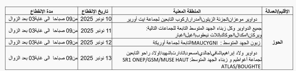 في إطار التحسين المستمر لجودة خدماتها، تعلن الشركة الجهوية متعددة الخدمات مراكش- آسفي إلى علم زبناء جهة مراكش-آسفي أنه سيتم برمجة أشغال صيانة شبكة الكهرباء، ما سينتج عنه  قطع التزويد بالتيار الكهربائي حسب البرنامج التالي :