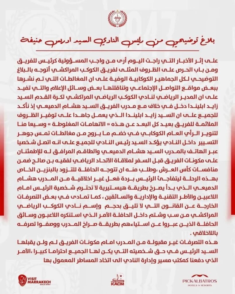 وأفاد المكتب المديري، في بلاغ، أن الدميعي بادر إلىلى “تقديم اعتذار شخصي وصريح لرئيس النادي (إدريس حنيفة)، معبّرا عن أسفه لما صدر عنه، ومؤكدا عمق الاحترام الذي يجمعه به، وقوة العلاقة القائمة على الثقة المتبادلة”.
