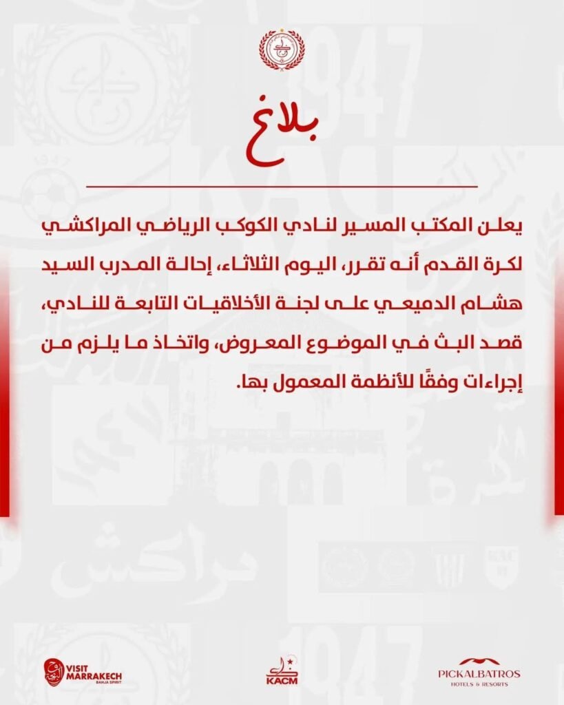 بعد إحالته على لجنة الأخلاقيات، أمس الثلاثاء 21 أبريل الجاري، أعلن نادي الكوكب المراكشي عن طي صفحة الخلاف مع المدرب هشام الدميعي.
