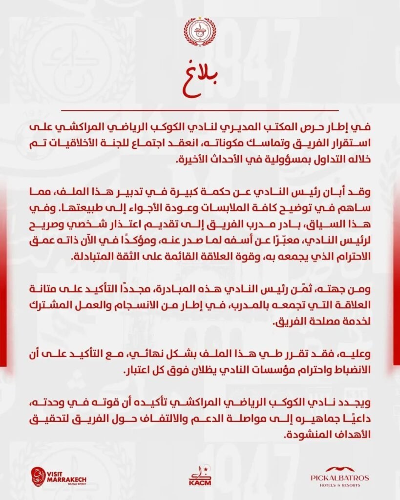 وخلص البلاغ إلى أنه “تقرر طي هذا الملف بشكل نهائي، مع التأكيد على أن الانضباط واحترام مؤسسات النادي يظلان فوق كل اعتبار”، داعيا جماهير النادي إلى مواصلة الدعم والالتفاف حول الفريق لتحقيق الأهداف المنشودة”.