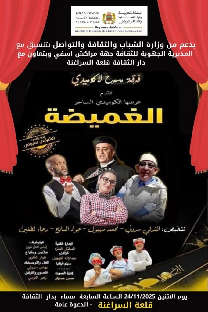 يُذكر أن هذا اللقاء يأتي ساعات قليلة قبل عرض هؤلاء الفنانين المشكلين لفرقة “مسرح لاكوميدي” لمسرحية ساخرة بعنوان “الغميضة”، ابتداءً من الساعة السابعة من مساء اليوم،  بدار الثقافة بقلعة السراغنة، بدعم من وزارة الشباب والثقافة والتواصل، وبتنسيق مع المديرية الجهوية للثقافة، وبتعاون مع دار الثقافة بقلعة السراغنة.