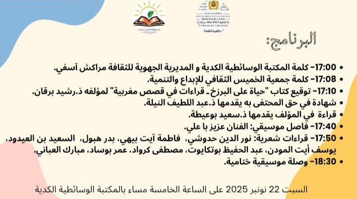 تخليدا للذكرى الخمسين للمسيرة الخضراء المظفرة، والذكرى السبعين لعيد الاستقلال المجيد، تنظم المكتبة الوسائطية الكدية بمراكش، تحت إشراف المديرية الجهوية للثقافة مراكش–آسفي، وبشراكة مع جمعية الخميس الثقافي للإبداع والتنمية، أمسية أدبية وفنية، ابتداءً من الساعة الخامسة من مساء بعد غد السبت 22 نونبر الجاري،، بقاعة الندوات للمكتبة.