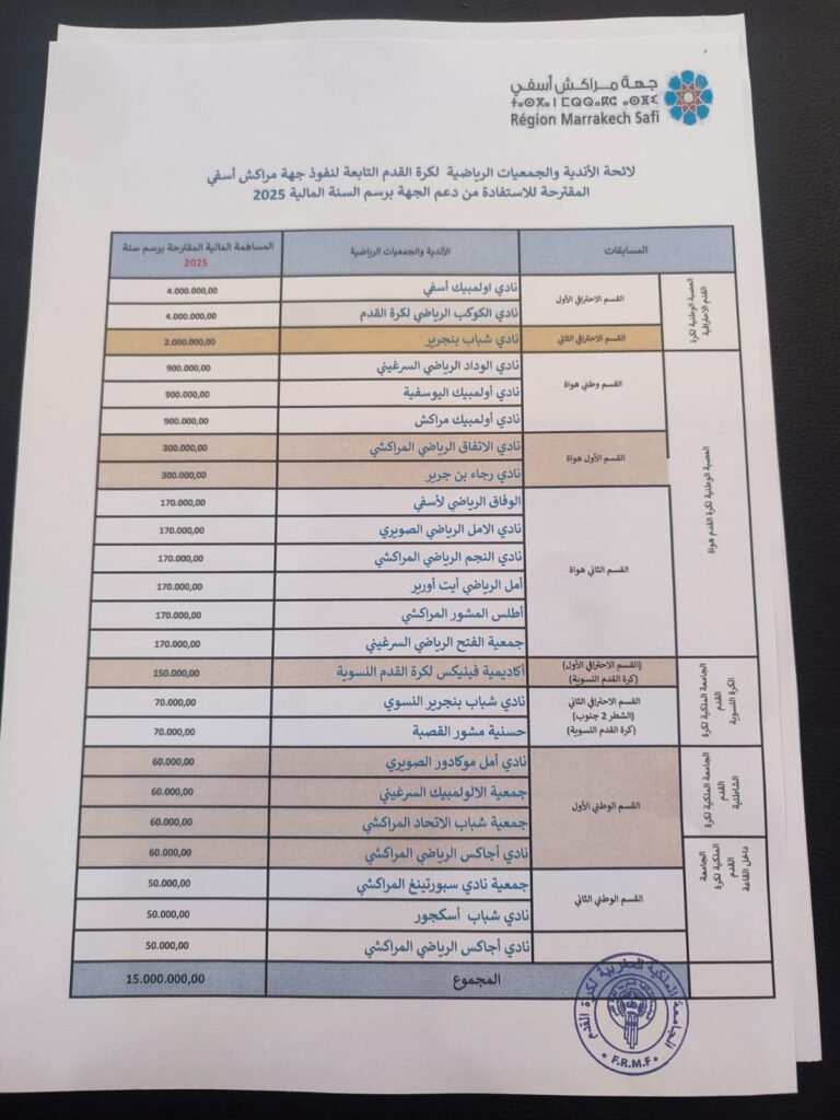 صادق مجلس جهة مراكش-آسفي، أمس الخميس 4 دجنبر الجاري، على لائحة فرق كرة القدم المستفيدة من الدعم المالي برسم سنة 2026.