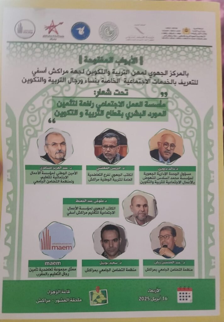 يحتضن المركز الجهوي لمهن التربية و التكوبن بجهة مراكش- آسفي الأبواب المفتوحة للتعريف بالخدمات الاجتماعية الخاصة بنساء ورجال التربية والتكوين، وذلك تحت شعار: “مأسسة العمل الاجتماعي رافعة لتثمين المورد البشري بقطاع التربية والتكوين”.