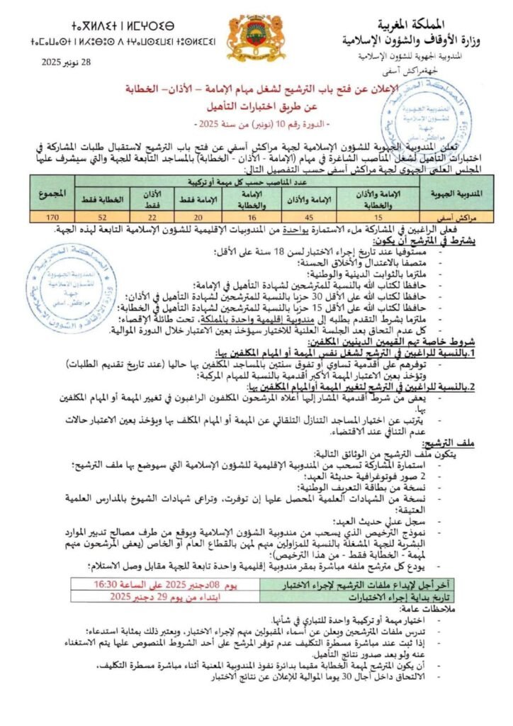 أعلنت المندوبية الجهوية للشؤون الإسلامية لجهة مراكش- آسفي عن فتح باب الترشيح لشغل 170 منصبا شاغرا في مهام: الإمامة والأذان والخطابة.